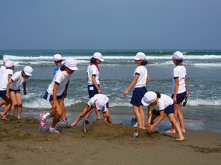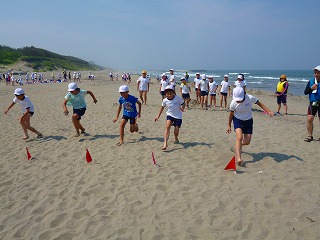 第2日目は,「とちぎ海浜自然の家」での活動です。朝は,潮風に吹かれながら気持ちよく海岸散歩をしました。きれいな貝殻をたくさん拾いました。その後,野外調理でカレー作りをしました。初めて鍋でご飯を炊きましたが,とてもおいしくできました。午後は,たっぷり3時間ほど砂浜活動をしました。広い海を眺めながら,とても楽しく活動できました。