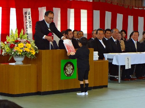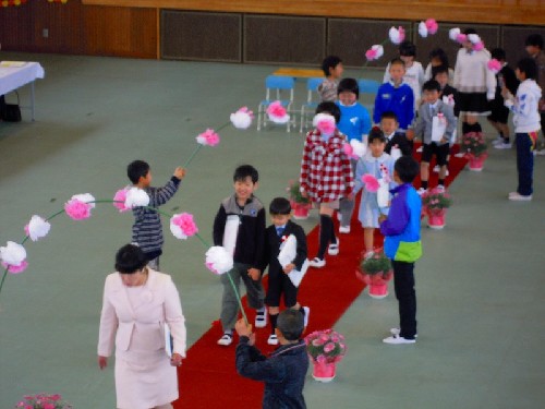 4月9日(火)に入学式を行いました。今年度の1年生は9名です。大きな拍手に迎えられ,6年生と手をつないで入場しました。担任に呼名され,誰もが大きな声で「はい。」と,元気に返事をすることができました。立派な態度で式に参加できました。