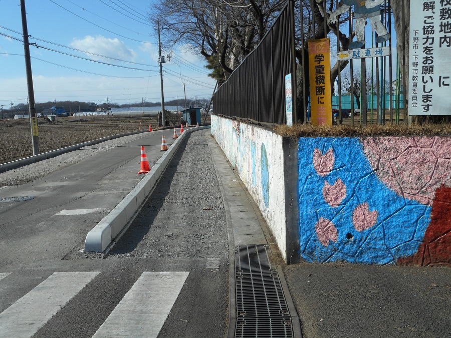 舗装はこれからですが、正門まで歩道ができました。以前は、学校南側の道路は狭くて歩道もなく危険を感じていましたが、子供達が安全に登校できるようになりました。