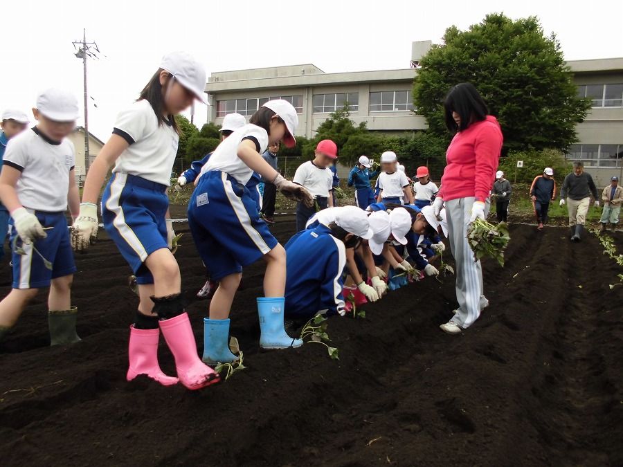 | 子供達の手で耕した田んぼに、子供達の手で苗を植えました。 | 地域の方の指導の下に、全校児童で、「安納芋」と「紅はるか」の苗を植えました。 |