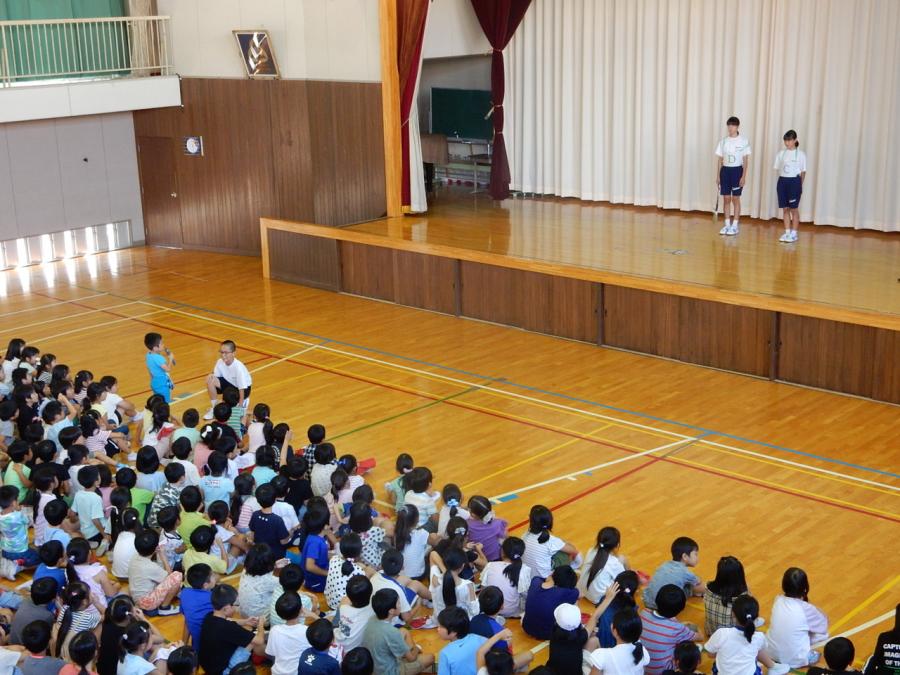 続いて、児童指導主任と学習指導主任の先生から、夏休みの生活(自分の命とマナーを守る)や夏休みの学習(決まった時間に行う、興味をもったことに思い切り取り組む等)についての話がありました。