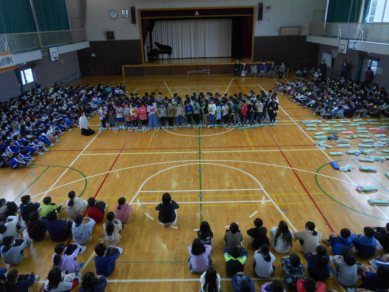 6年生96名が、市長様からメダルを、教育長様から、努力賞、健康賞、親切賞、体育賞、明朗賞、友情賞、学芸賞のそれぞれの賞をいただきました。また、市青少年育成市民会議の皆様から、英語のノートをいただきました。