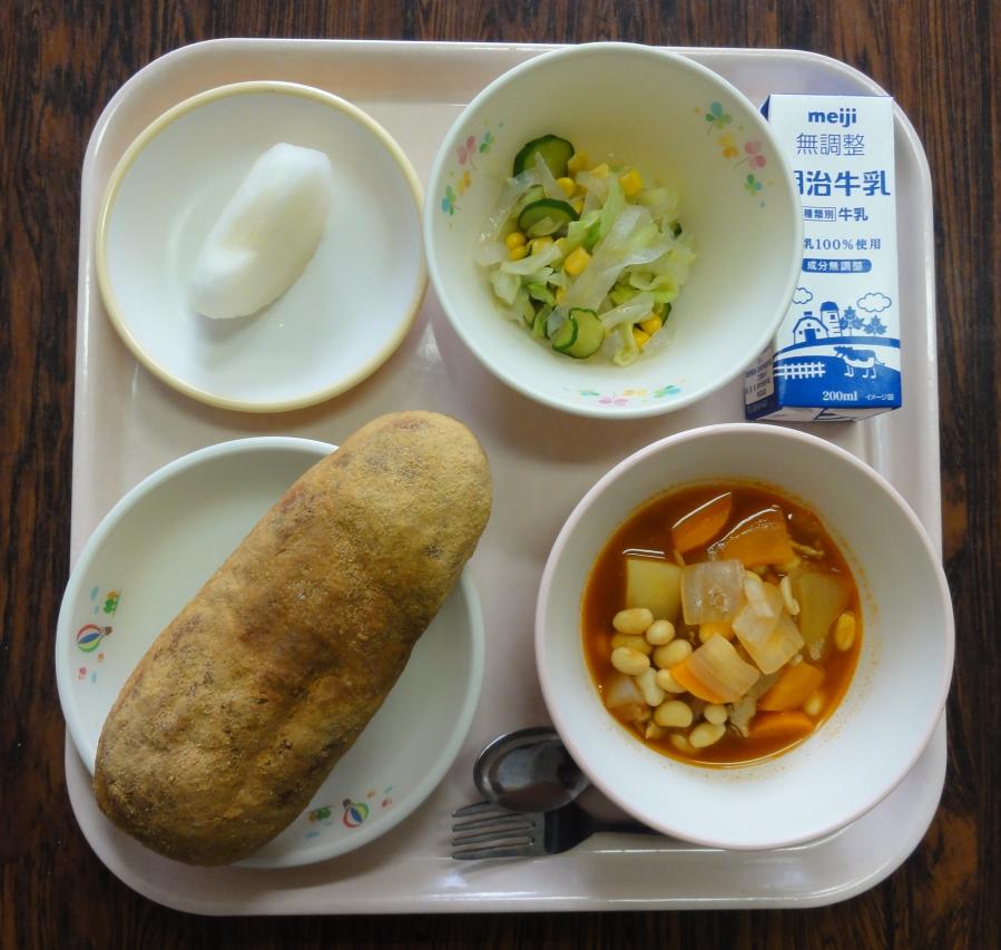 9月1日から給食のおぼんが長方形から正方形に変わりました。給食は、みんな静かに、おしゃべりをせず、食べています。今日の給食は、きな粉揚げパン、ポークビーンズ、こんにゃくサラダ、梨、牛乳でした。