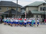 中休み、全校児童が校庭に集まってきます。今日から持久走大会の練習の始まりです。音楽が流れ、10分間自分のペースで走ります。自分の走りやすい速さで走り続けます。みんな一生懸命です。最初にペースを上げすぎると途中で苦しくなったり、お友達と一緒に走ろうとすると自分のペースがつかめなくなったり。走りながらだんだん自分の走りやすい感覚がつかめてきます。真剣に練習する子供たちの姿はとても清々しいです。走り終わると満足そうな表情と汗がきらきら光っていました。今日から持久走大会本番まで練習を重ね、一人一人が自分のペースで挑戦できるよう励ましていきたいと思います。ご家庭でも励ましていただきますと幸いです。地域の皆様、校庭での練習では音楽などご迷惑をおかけしていますが、ご理解ご協力に感謝いたします。今後もよろしくお願いします。