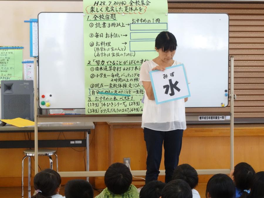 4月から7/19まで休まず登校できた児童は53名。校長から53名を紹介し、皆で拍手を送りました。そして、全校宿題(読書3冊以上、毎日手伝い、料理に挑戦)やイチロー選手の努力する姿、おすすめの本の紹介の話をしました。さらに、児童指導主任から、「水」「車」「ゲーム機」に注意しようという話もありました。79名全員が笑顔で9/1に会えることを願っています。