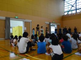 たくさんのおじさん、おばあさんに参加していただき、それぞれの学年の活動に取り組みました。1・2年生は昔遊び、3・4年生はわらでっぽう作り、5・6年生は勾玉作りをしました。児童もやり方を教えてもらいながら楽しそうに活動していました。暑い中来校してくださりありがとうございました。