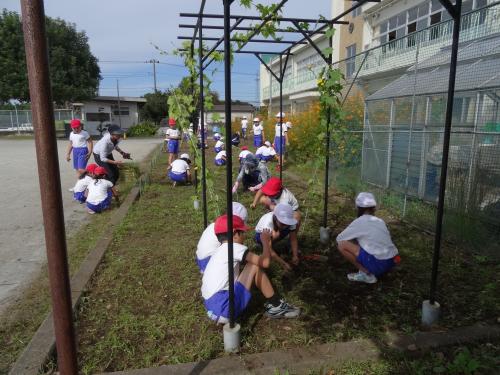 校庭の花の周りに生えている雑草が伸びてきたため、全校児童で除草活動を行いました。自分の担当場所を決め、そこにある雑草をきれいに抜きました。校庭を彩る花がより一層生え、素敵な秋の風景が見られます。