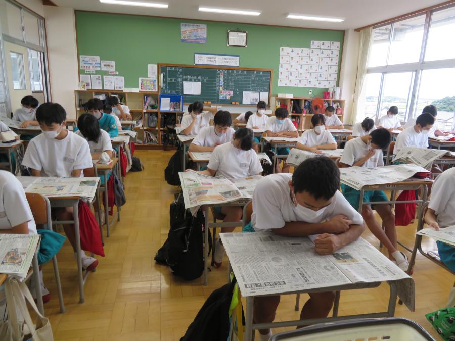 9月1日の夕顔タイム(朝の学習)は、『下野市新聞の日』として、生徒全員が新聞を読みました。その後、一人一人がそれぞれの感想等を、ノート等に書きました。『下野市新聞の日』は、活字に親しみ、読解力を向上させ、社会情勢に関心を持つことを狙って、今年度3回実施される予定です。今後、ご家庭でも、新聞への興味・関心が高まることを期待しています。
