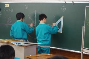 12月13日(水)、5校時に、S&U(下野市と宇都宮大学)コラボ事業として、宇都宮大学から日野先生をお招きして研究授業を行いました。1年2組、数学、平塚先生の授業で、課題は「75°の角を作図しよう」というものです。今までに学習した円の2等分線の作図や三角形の性質を利用していろいろな方法で75°の角度を作ることで、図形の性質を確認することができます。答えを教えてしまえば簡単ですが、自分で考えて、また友達の考え方を生かして、さらにグループを作り、教え合うことで思考力を高めることがねらいです。生徒達は50分の授業時間いっぱいいろいろな考え方を試していました。