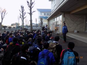 朝、学校に来てみるとサンタの集団がいました。毎週月曜日に野球部の皆さんがしている学校近辺のゴミ拾いを、今日はサンタクロースのコスチュームで行っていました。また、あいさつ運動として、小学校に登校する生徒とハイタッチでふれあいました。小学生も喜んでくれたようです。あいにくの霧のなかの写真ですが、笑顔で一日が始まれることに感謝します。