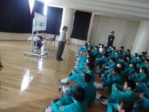 全校集会では、給食を安全に協力して食べられるように、配膳のマナーや気をつけることを全校生徒で確認しました。2、3年生が1年生の手本となり、素早く静かに整列し、話もよく聞いていました。