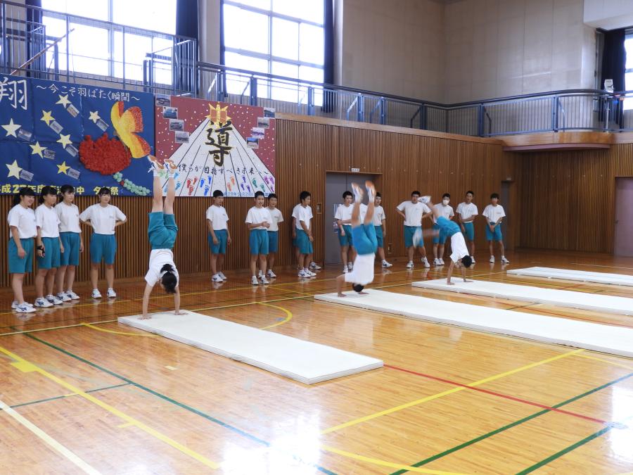 10月17日(水)、朝会は生徒会役員、生徒会専門委員会委員長、学級委員長の任命を行いました。前期の委員長さんの後を引き継いでリーダーシップを発揮してもらえればと思います。2校時は先週に引き続き、教育実習生による研究授業がありました。2年2組保健体育のマット運動の授業です。生徒はきびきびした動きで、多くの種類の補強運動や倒立前転を練習していきました。実習生のきびきびとした指導とていねいな説明で、生徒は積極的に練習に励んでいました。