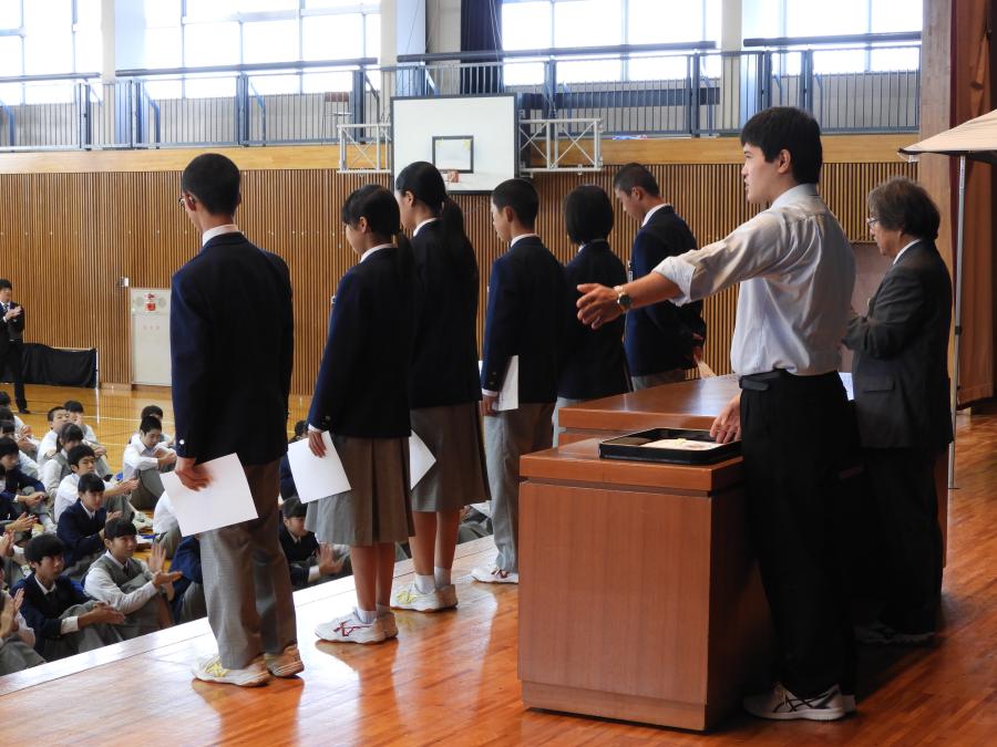 10月5日(金)、6校時に前期終業式を行いました。各学年代表生徒による前期の反省の発表では、それぞれの学年の反省と後期にむけての抱負が発表されました。校長式辞では、各学年の成長したところ、頑張ったところを讃え、後期にむけては強さ、たくましさを身に付けてほしいという内容を伝えました。式に臨む態度も立派でした。