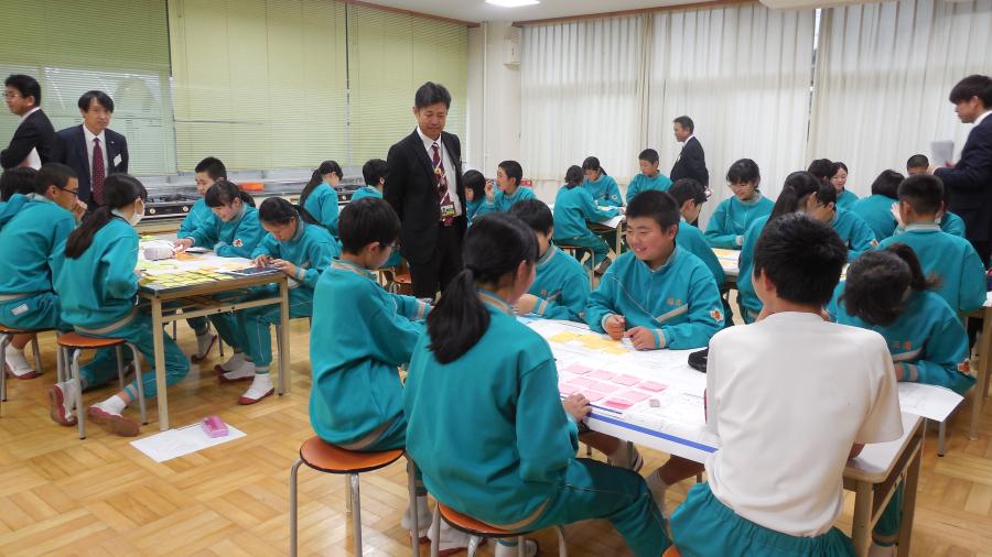 11月6日(火)、1年生が、義務教育学校の設計に関して「魅力的な学校を作るために、どんなものがあるといいと思いますか?」というテーマでワークショップを行いました。この日は下野市の教育総務課の方や設計業者さんがみえて、義務教育学校の設計について、生徒達から意見を出してもらいました。生徒ならではの意見も出て、楽しそうにワークショップに参加していました。