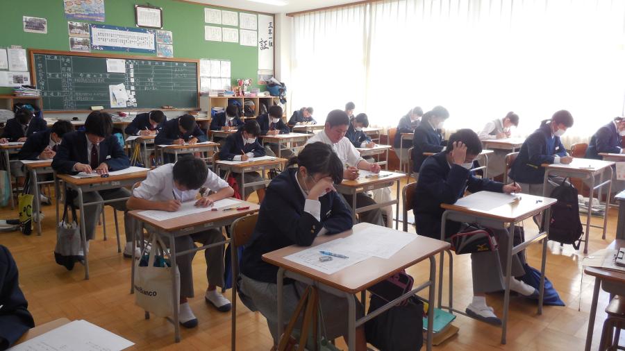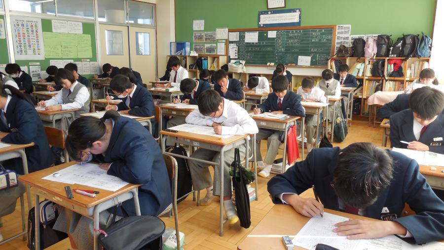 11月15日(木)、後期中間テスト1日目です。最初の写真は昇降口の3年1組、3年2組の靴箱の写真ですが、通学靴が全てあることから欠席が誰もいないこと、そして靴箱に通学靴がきちんとそろえてあることから落ち着いた生活をしていることがうかがえます。写真のクラスだけでなく、全校で欠席がほとんどいないことや、靴のかかとをつぶしたり乱雑に靴をいれる生徒がいないことなど、これだけで安心した気持ちになります。残りは1校時目の中間テストの様子ですが、どのクラスも真剣な態度が伝わってきます。また、写真はありませんが、朝、校舎を巡回していると、早朝から登校して自習している生徒も見かけます。気温はさがりましたが、うれしい気持ちになった朝です。