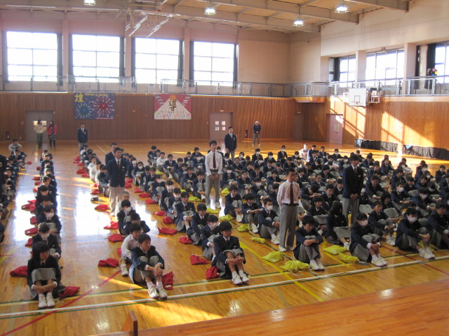 11月28日(水)、朝会は、新人大会等の表彰を行いました。多くの生徒の活躍を全校で讃えることができました。表彰にふさわしい静粛な態度と、写真でわかるように寒い体育館でもワイシャツ姿の生徒も見られるような元気な姿は本当にうれしいものです。校長からは、この立派な態度や整然とした靴箱の使い方などを褒め、さらに教室や公共の場所も大切にし、また、ものだけでなく人に対する気遣いにも生かしてほしいと話しました。